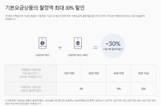 가족가입년수가 30년이상이 넘어가면 결합대상자들 모두 통신요금 30%을 할인 대상자가 됩니다.